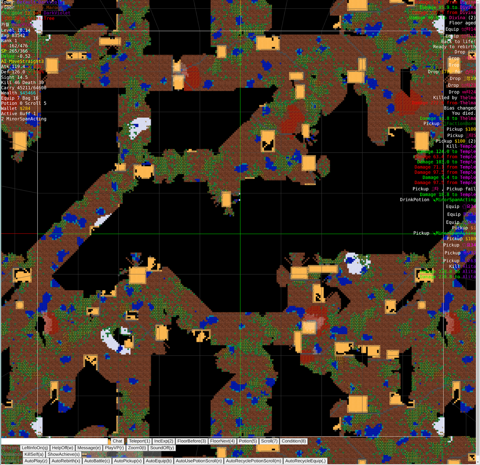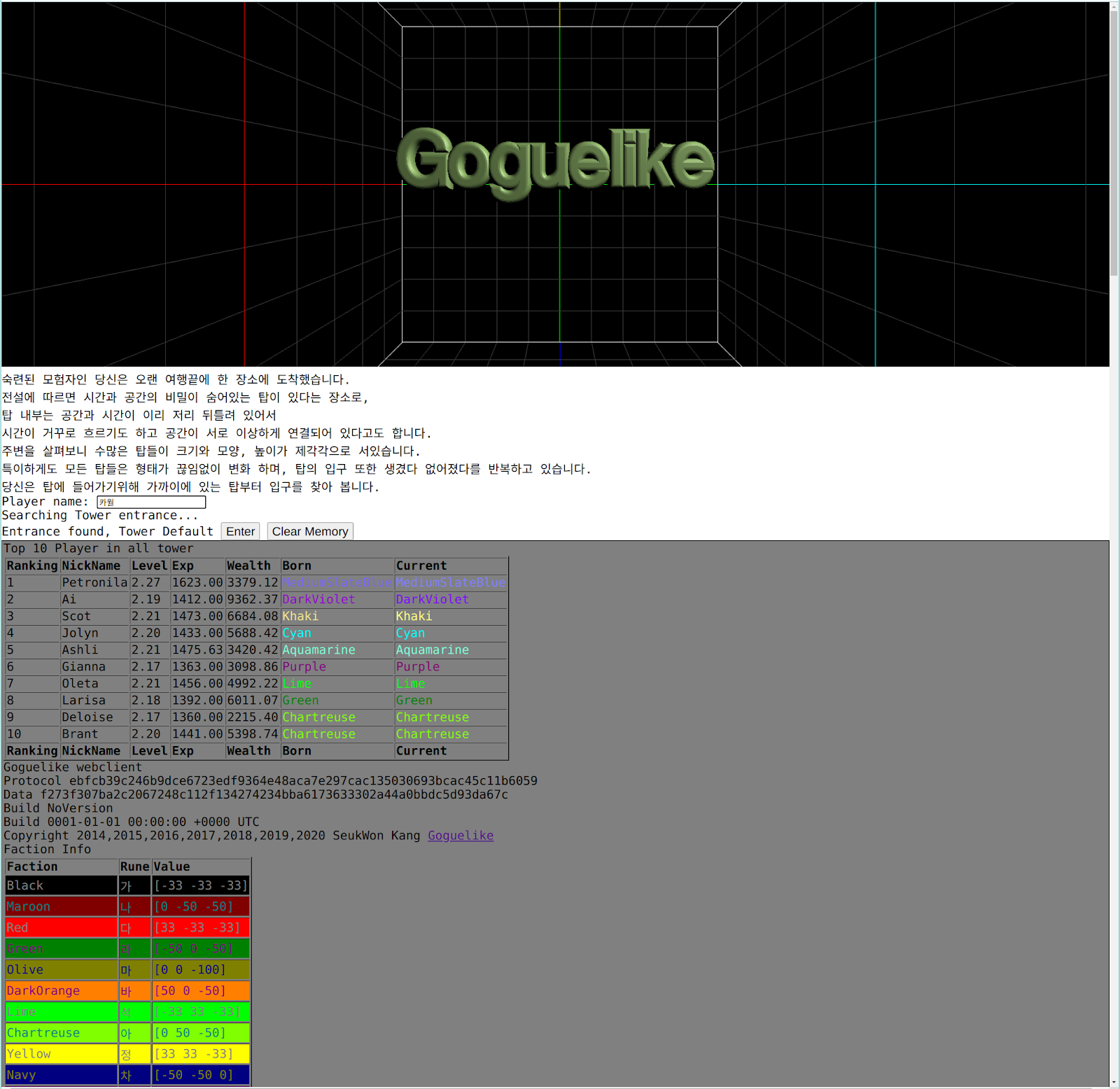 goguelike 의 webgl client 작업 By SeukWon Kang June 16, 2020 webgl 의 CanvasTexture 를 사용한 PlaneBufferGeometry 를 terrain표시용으로 사용하는 gl client 입니다. canvas 만 사용할때는 wrap around 되는 field의 표시를 위해 귀찮은 작업(계산) 을 해야 했는데 CanvasTexture 의 RepeatWrapping 과 repeat 기능을 사용하니 간단히 해결되는 군요. 역시 신기술이 좋은 겁니다. ㅠㅠ webgl goguelike